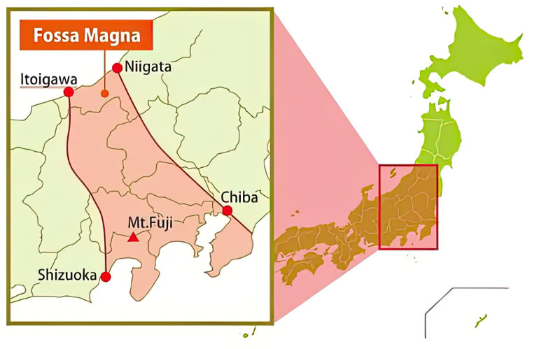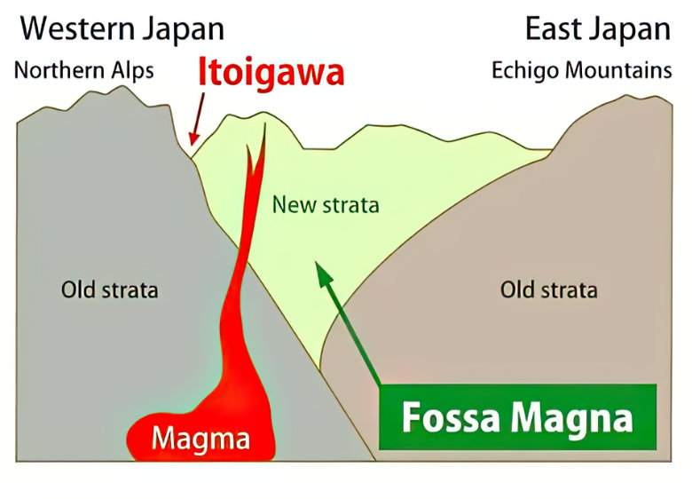 Faults that developed due to Fossa Magna's compression opened a path for magma, facilitating the surfacing of minerals and jade-containing serpentine rocks. This accessibility led to the discovery of numerous minerals in Itoigawa City, positioned on the Fossa Magna's border.