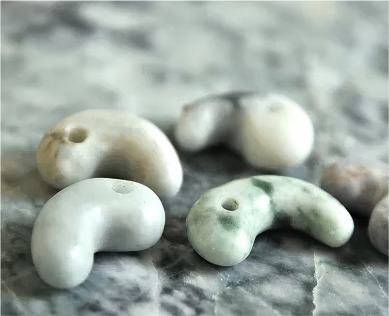 The gallery showcases a variety of items, including magatama, bracelets, tubular beads, and small raw stones. Please note that we do not display the works from our online shop in the gallery. Please get in touch with us in advance if you wish to see a particular piece.