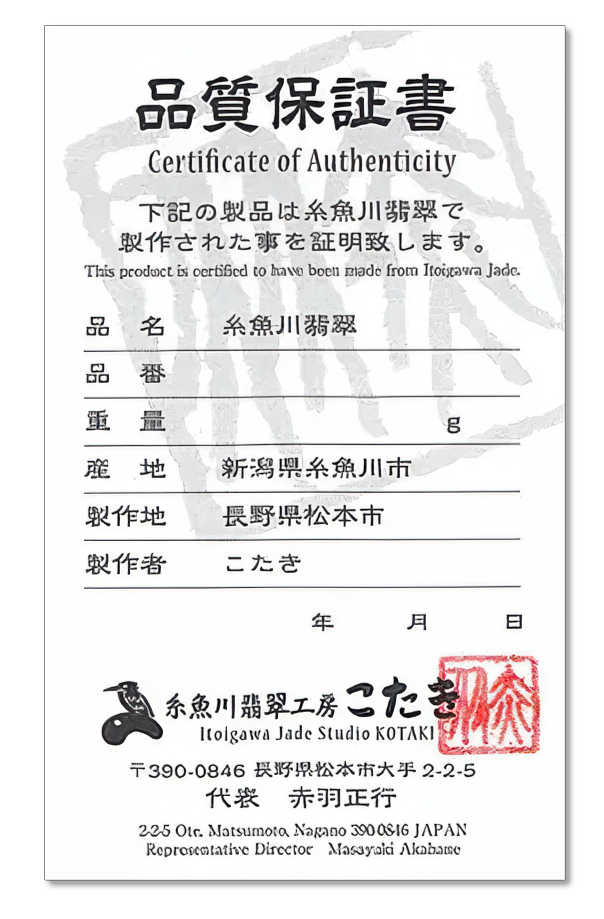 You can find detailed information about the allure and history of jade in our online shop, Itoigawa Jade Studio KOTAKI.You can find detailed information about the allure and history of jade in our online shop at Itoigawa Jade Kotaki Studio.