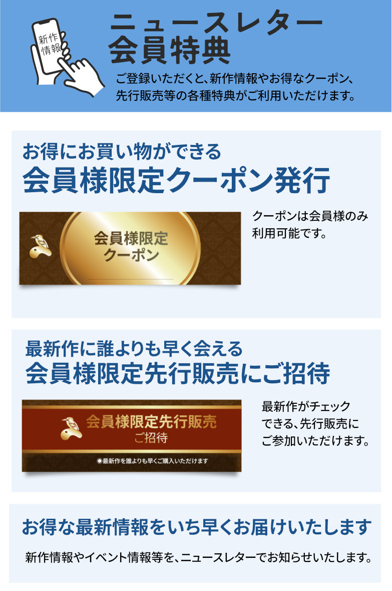 ニュースレター会員にご登録いただくと、新作情報やお得なクーポン、会員限定先行販売等の各種特典がご利用いただけます。